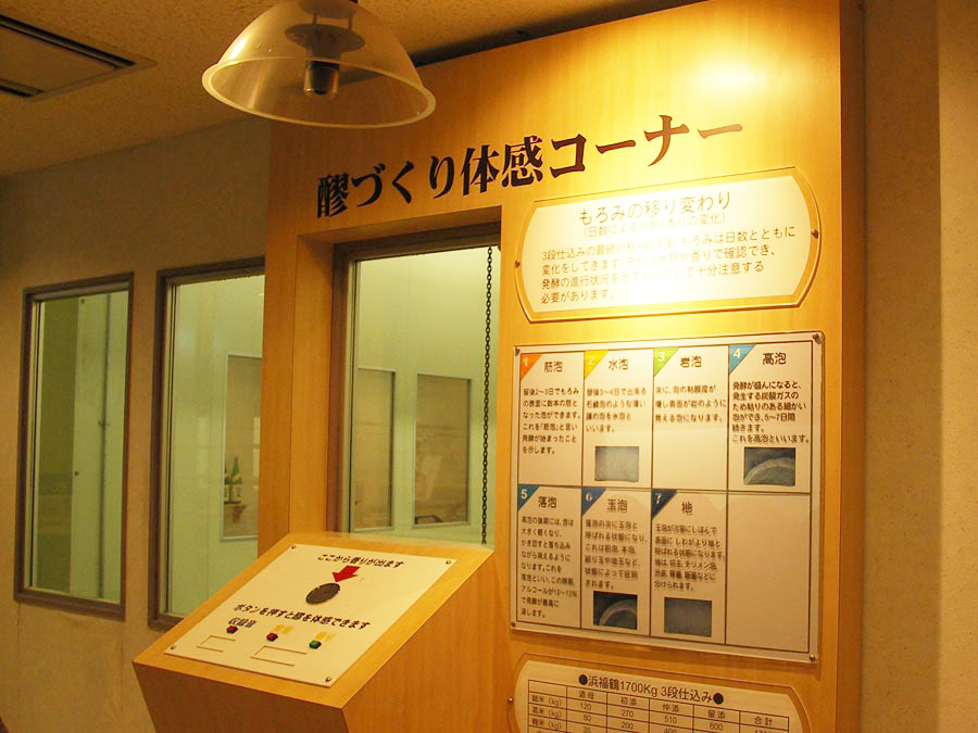 数ある酒蔵テーマ館のなかでも「もろみ仕込み」を体感できるのが浜福鶴吟醸工房の大きな特徴です。ふつふつと醗酵する“酒の声”を聞き、実際のモロミのあまい香りにつつまれながら酒造りの極意を体感ください。お酒が出来るまでの工程をパネルやビデオにて解説したコーナーや、江戸時代から使われている酒造道具の展示などもございます。